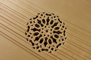 String length: 60cm, bowl with 25 ribs in ash and rosewood spacers, soundboard in spruce edged with rosewood binding, fingerboard in rosewood, brown stained bridge in corm wood, neck and pegbox with rosewood, walnut and maple veneer, pegs in rosewood and nut in bovine bone.