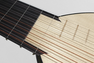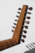 String length: 59cm, bowl with 11 ribs in honey locust and maple, soundboard in spruce edged with pear wood binding, fingerboard and nut in pear wood, bridge in corm wood and maple, neck and pegbox in maple, pegs in rosewood.